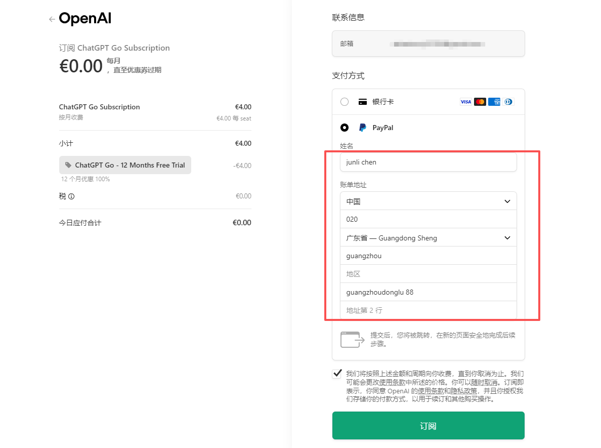 4、这时候我们看到支付页面,点击“PayPal”支付栏,这里可能需要填写一下你的PayPal资料,账单转换成中国即可。这里是不会有任何问题的!填写完之后,在点击:“订阅”即可。这个时候就会