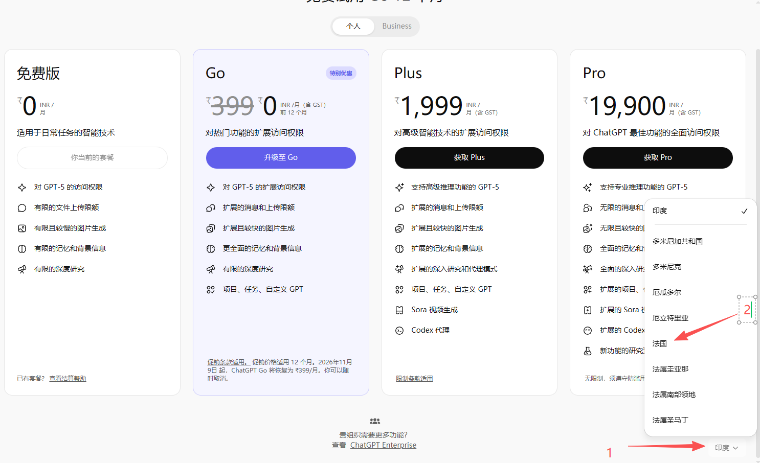 3、这时我们可以看到以下页面,拉下来,看到地区转换按钮,点击:转换到法国地区,页面会自动跳转,如果没有自动跳转的,那么按F5刷新即可,这时候我们可以看到:升级至GO的页面上的价格会转变成欧元。这个时候我们就点击:“升级至GO”,即可。